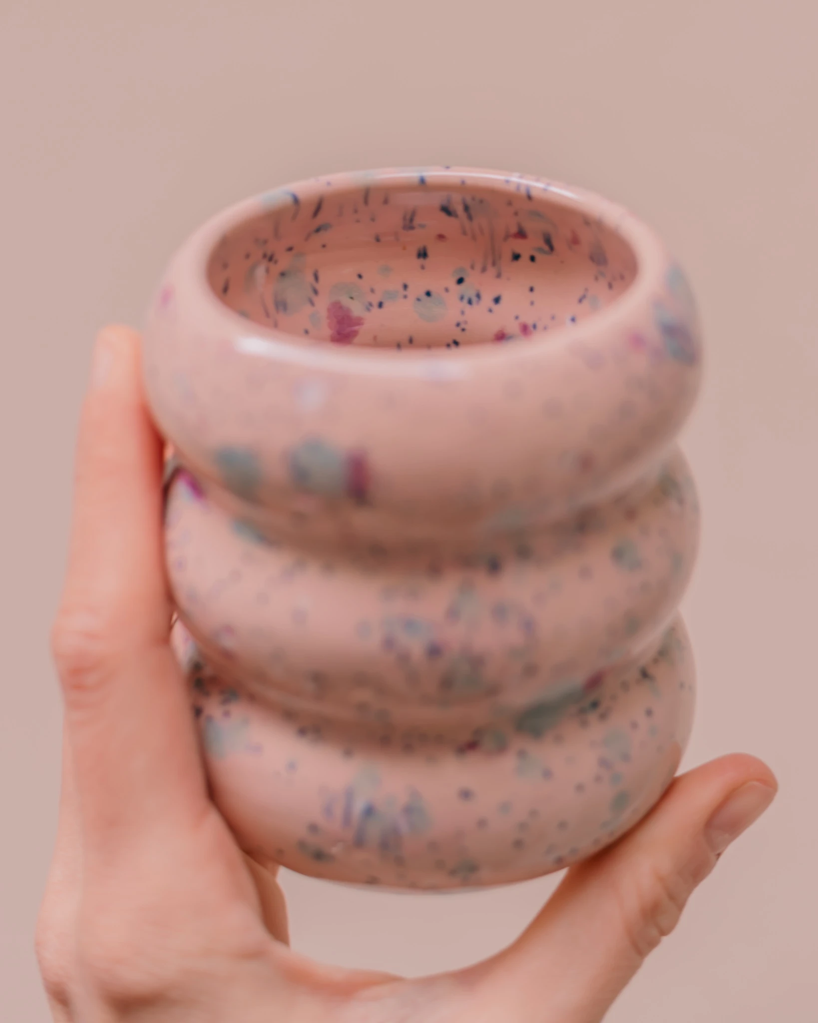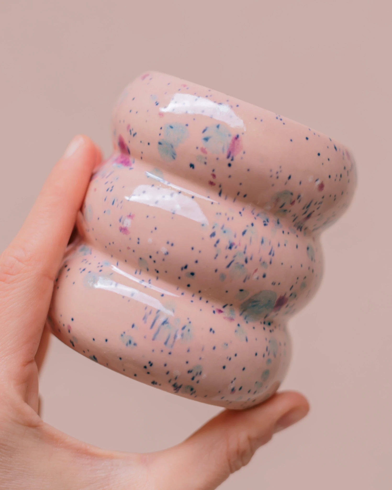 Ręcznie wykonany i szkliwiony kubek brzuszek, w kolorze baby pink, z fioletowymi plamkami.