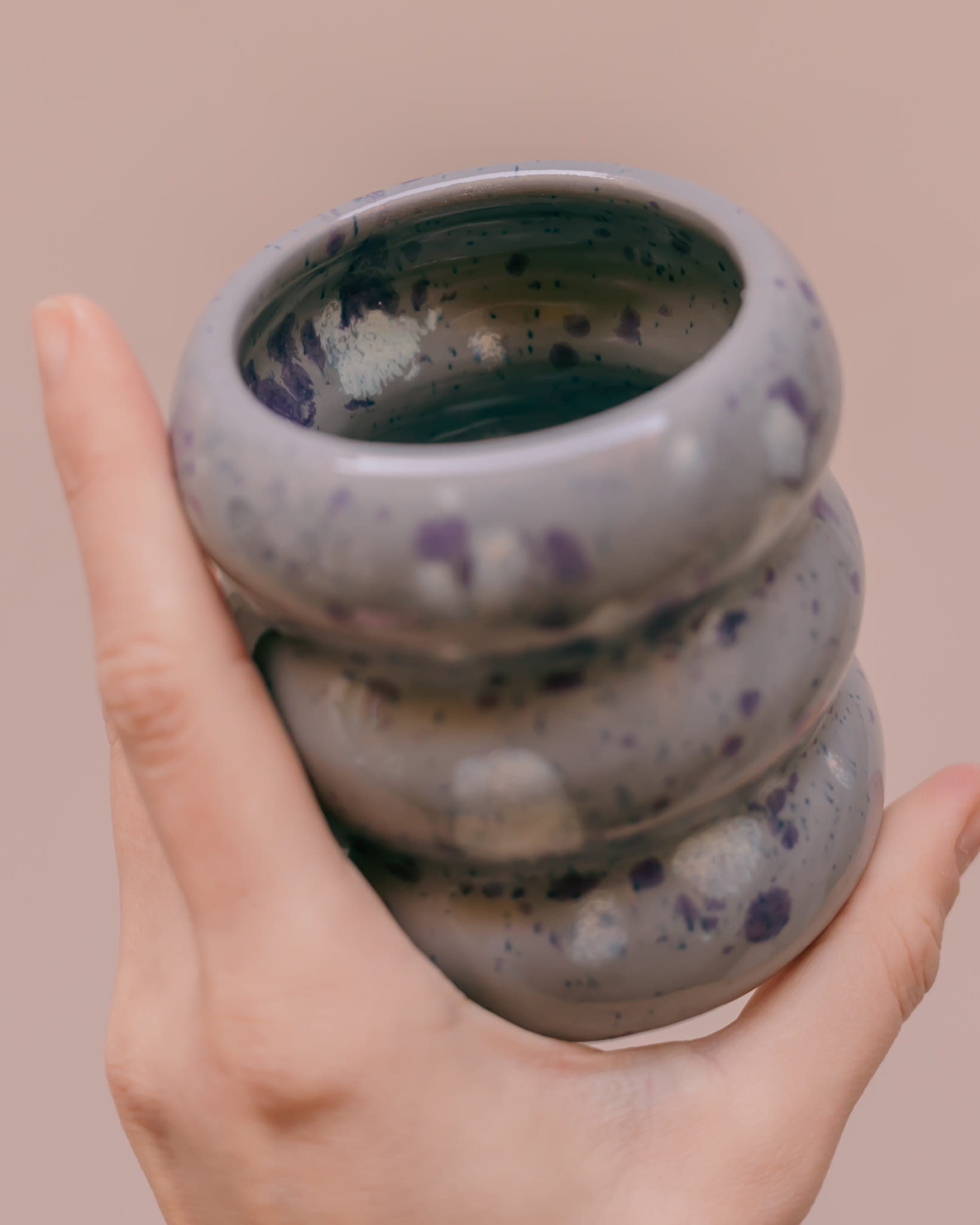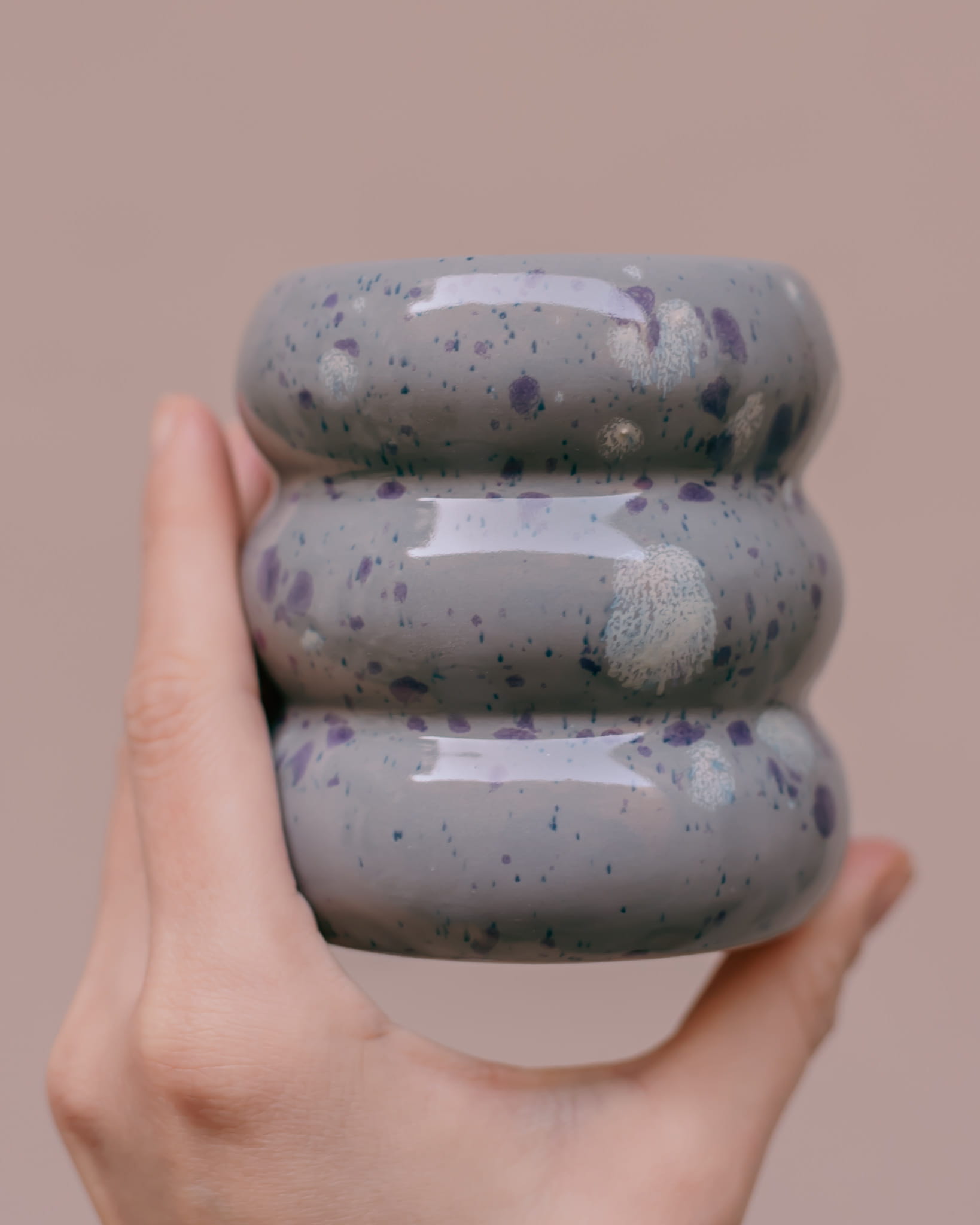 Ręcznie wykonany i szkliwiony kubek brzuszek, w kolorze szarym, z kropeczkami.