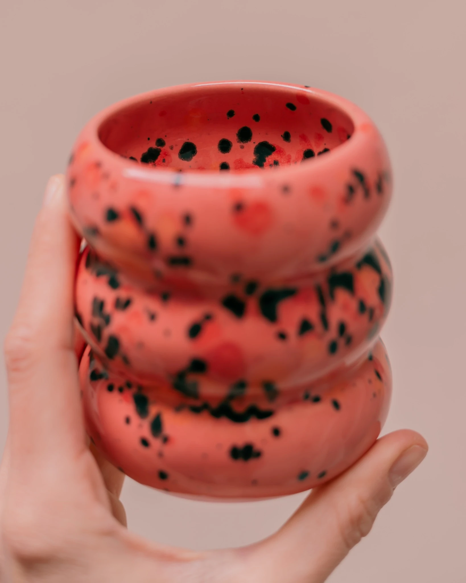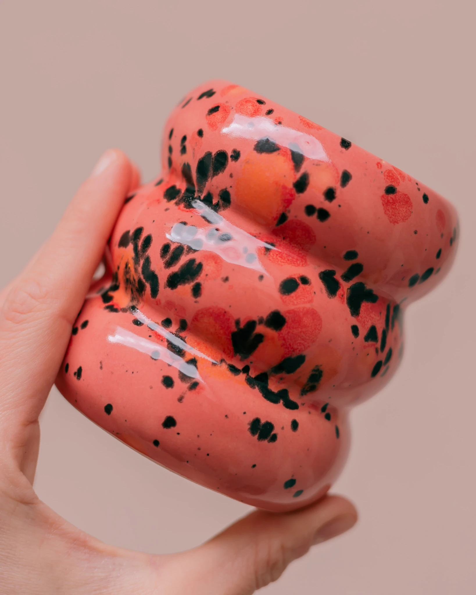 Ręcznie wykonany i szkliwiony kubek brzuszek, w kolorze czerwonym w kropeczki.