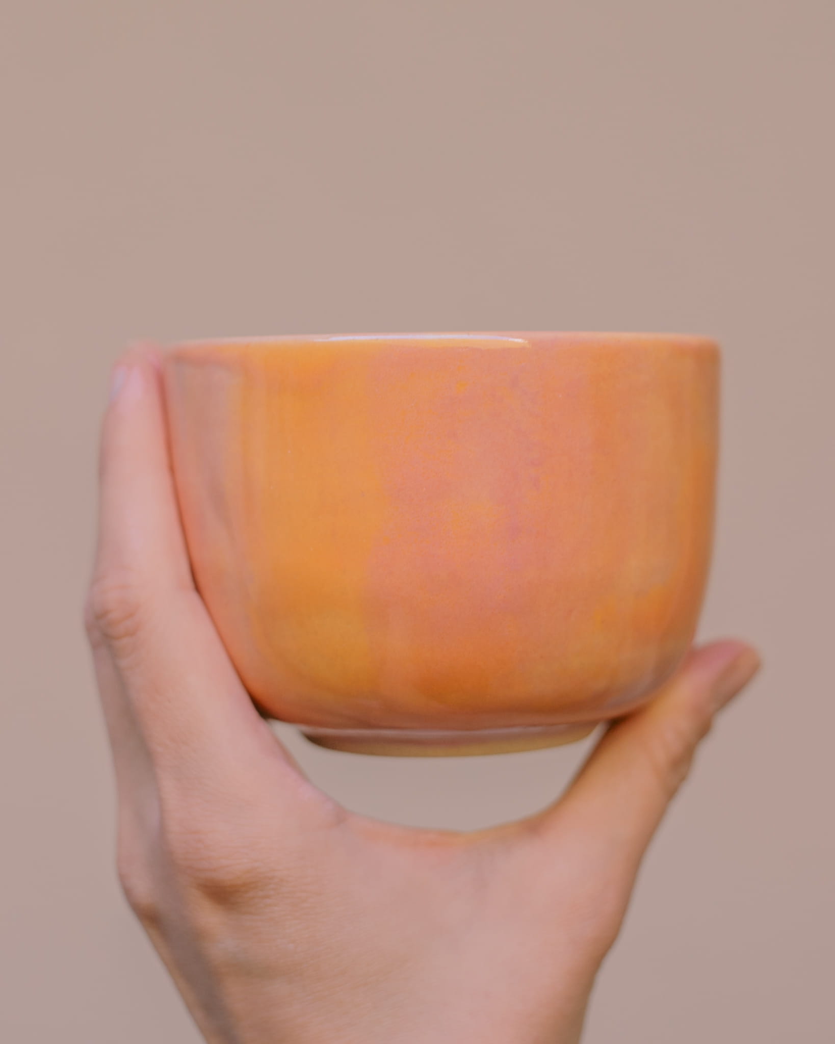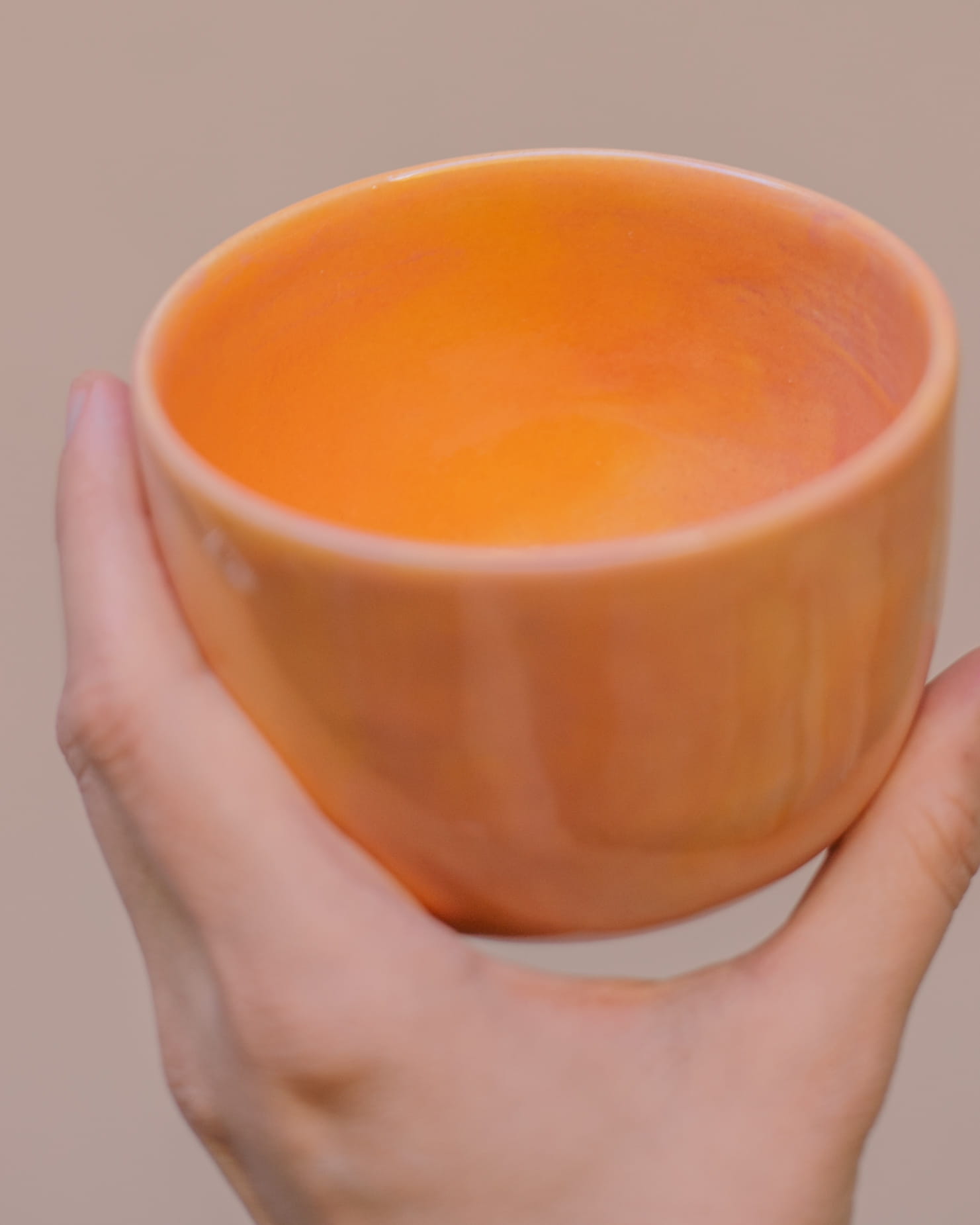 Ręcznie wykonana i szkliwiona czarka bez ucha, w kolorach zachodzącego słońca.