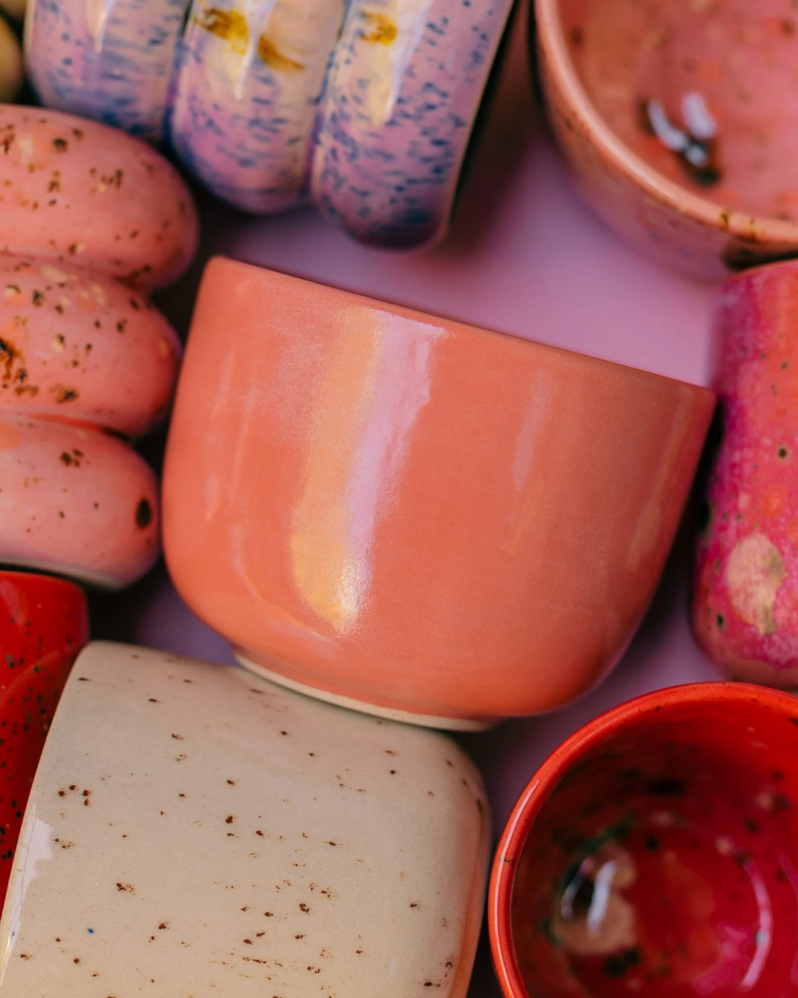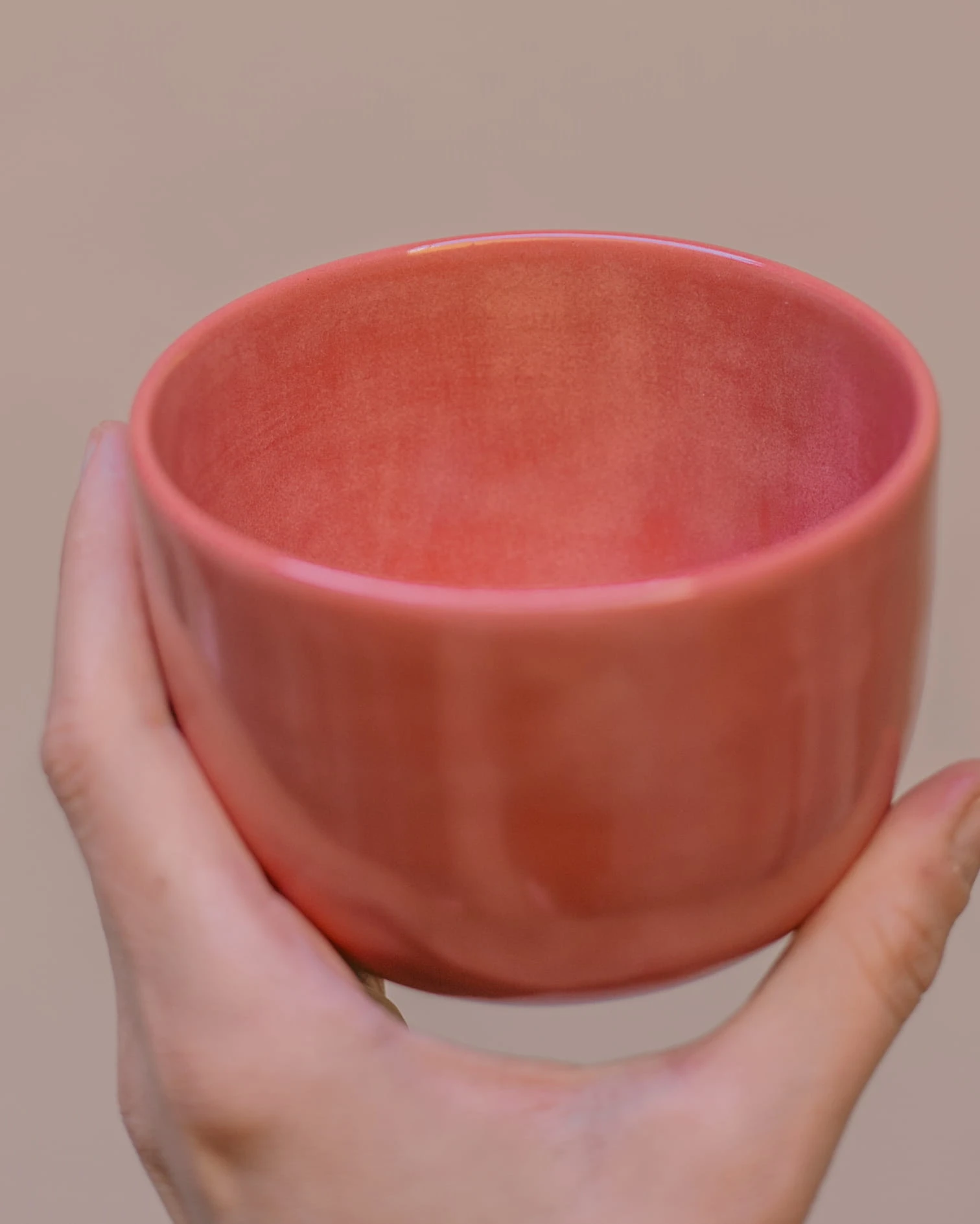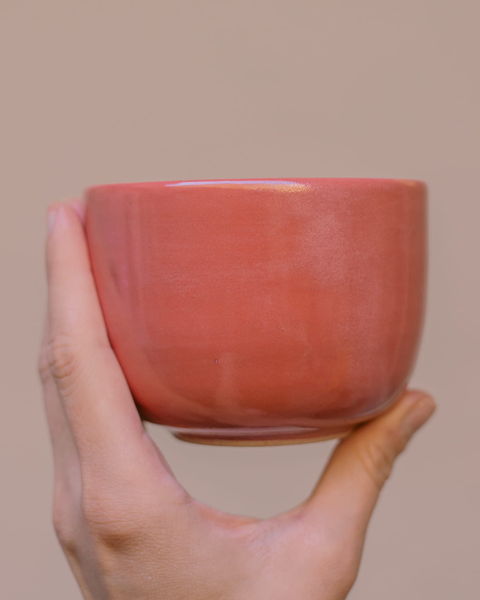 Ręcznie wykonana i szkliwiona czarka bez ucha, w kolorze malinowym.
