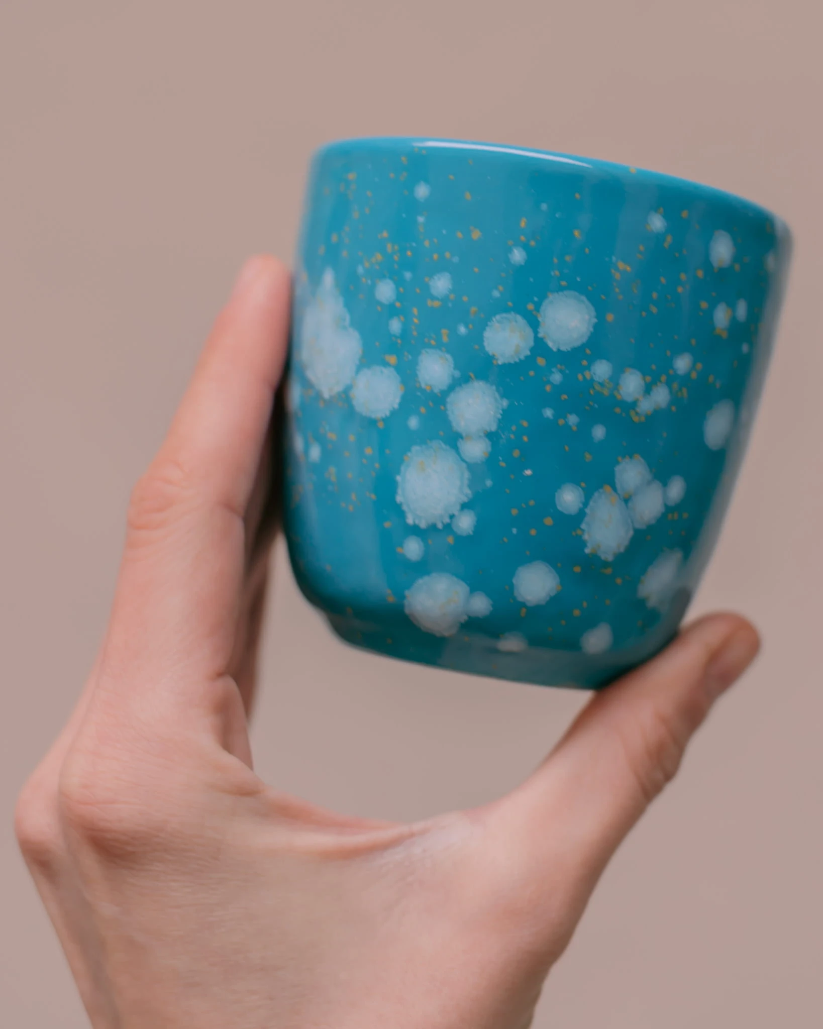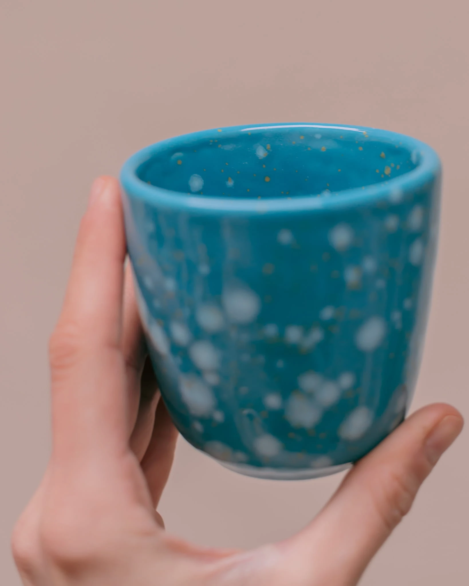 Ręcznie wykonana i szkliwiona czarka bez ucha, w kolorze niebieskim.