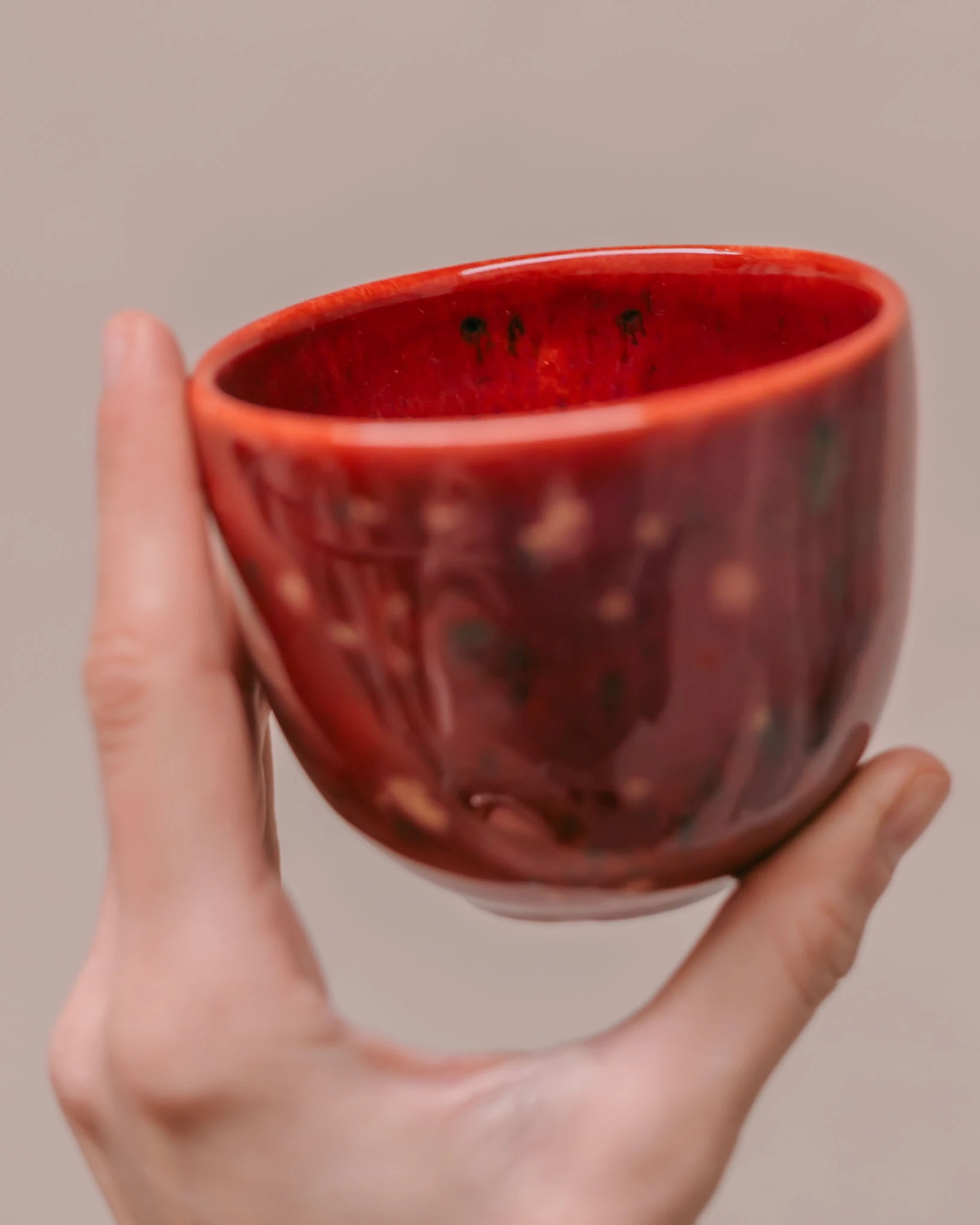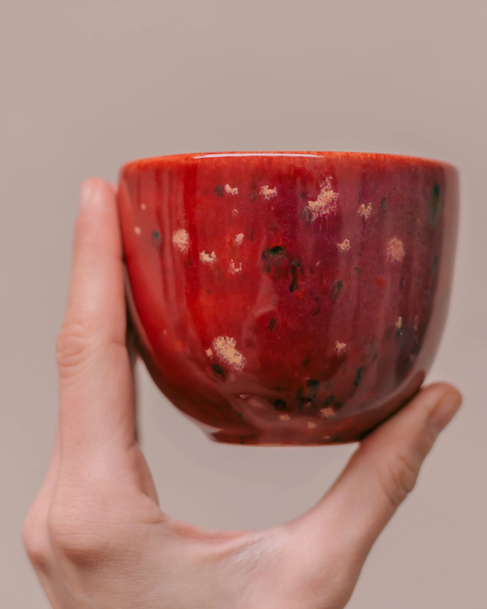 Ręcznie wykonana i szkliwiona czarka bez ucha, w kolorze cynamonowym, z ulubionymi plamkami.