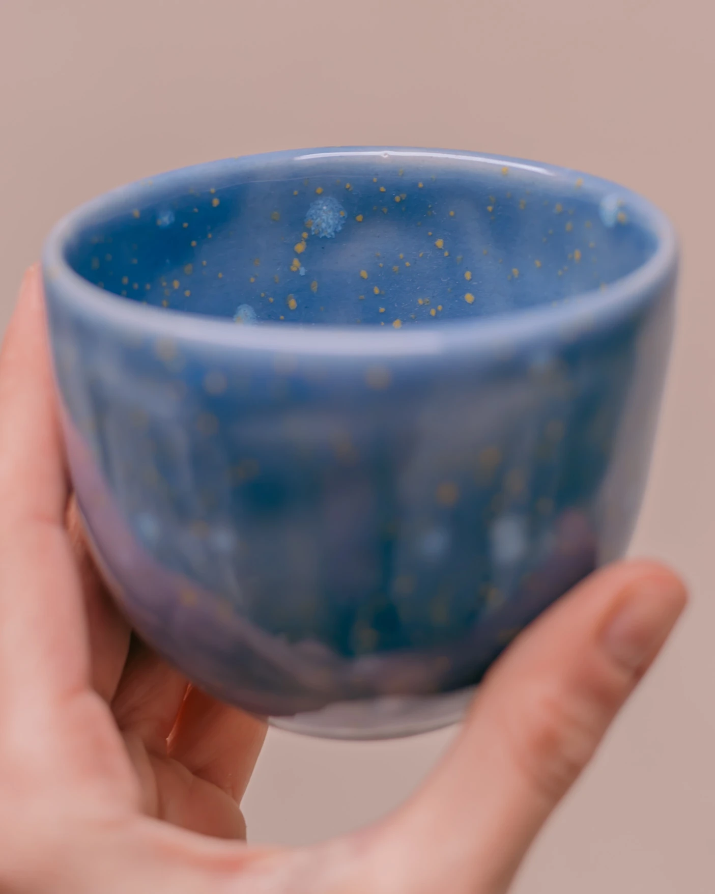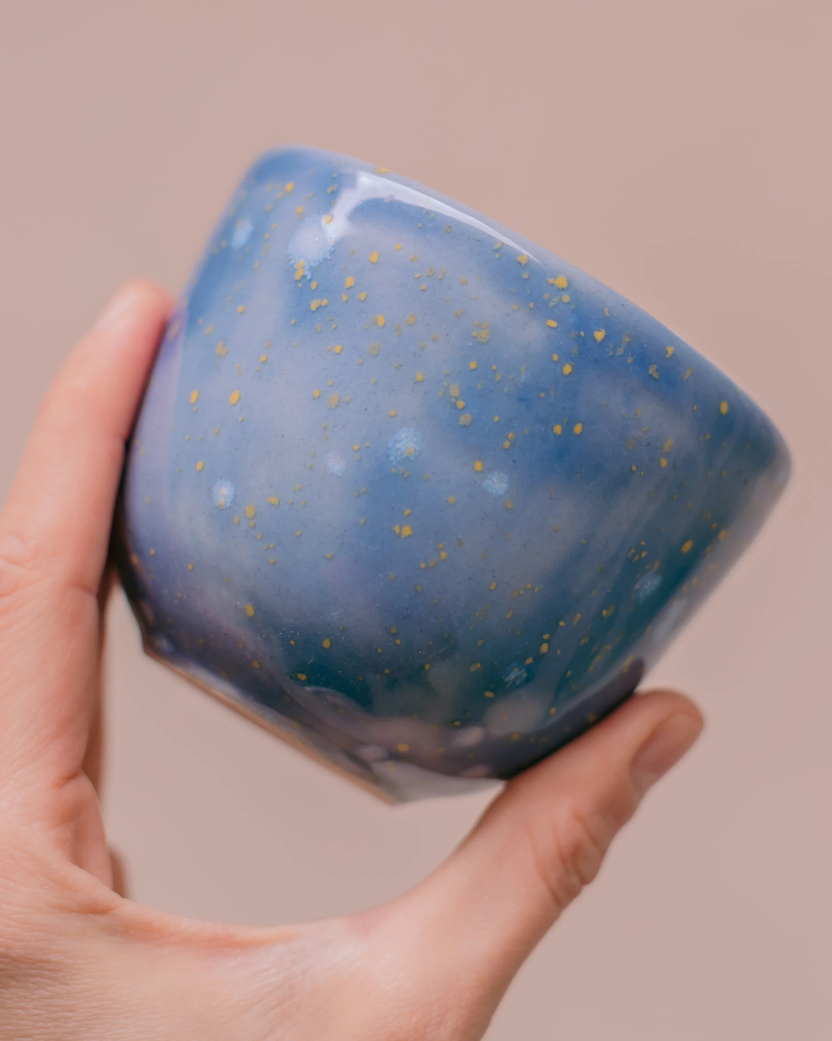 Ręcznie wykonana i szkliwiona czarka bez ucha, w kolorze niebieskim.