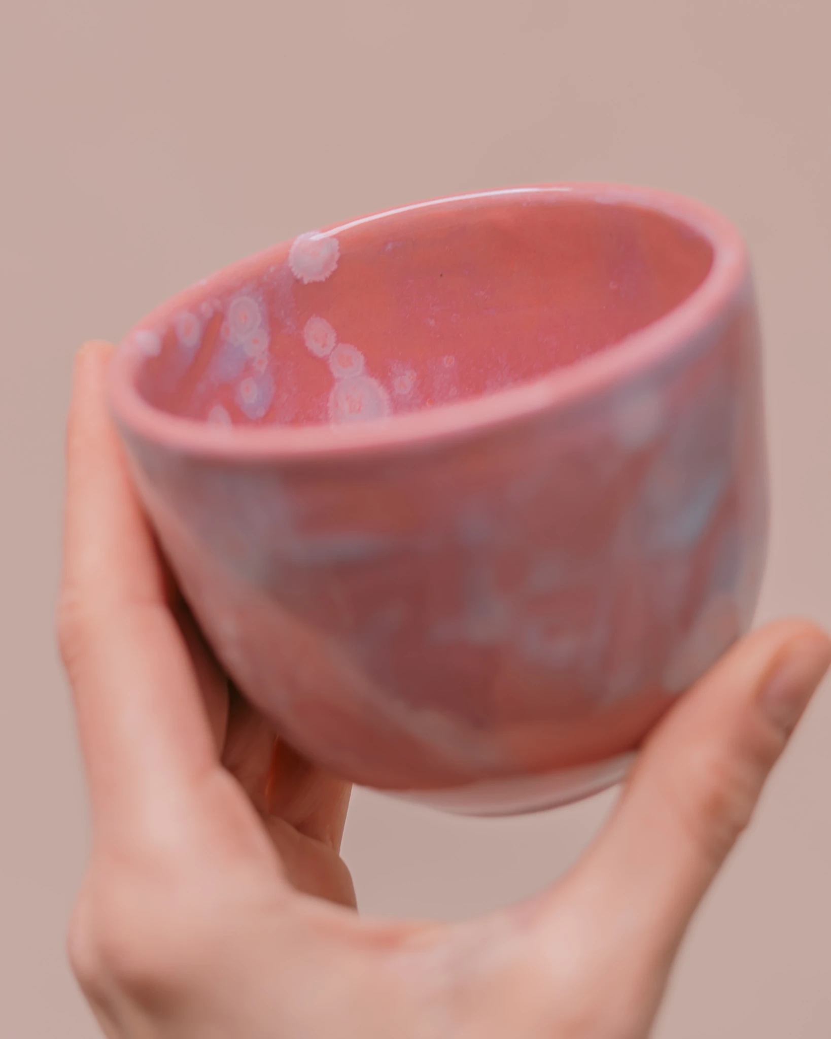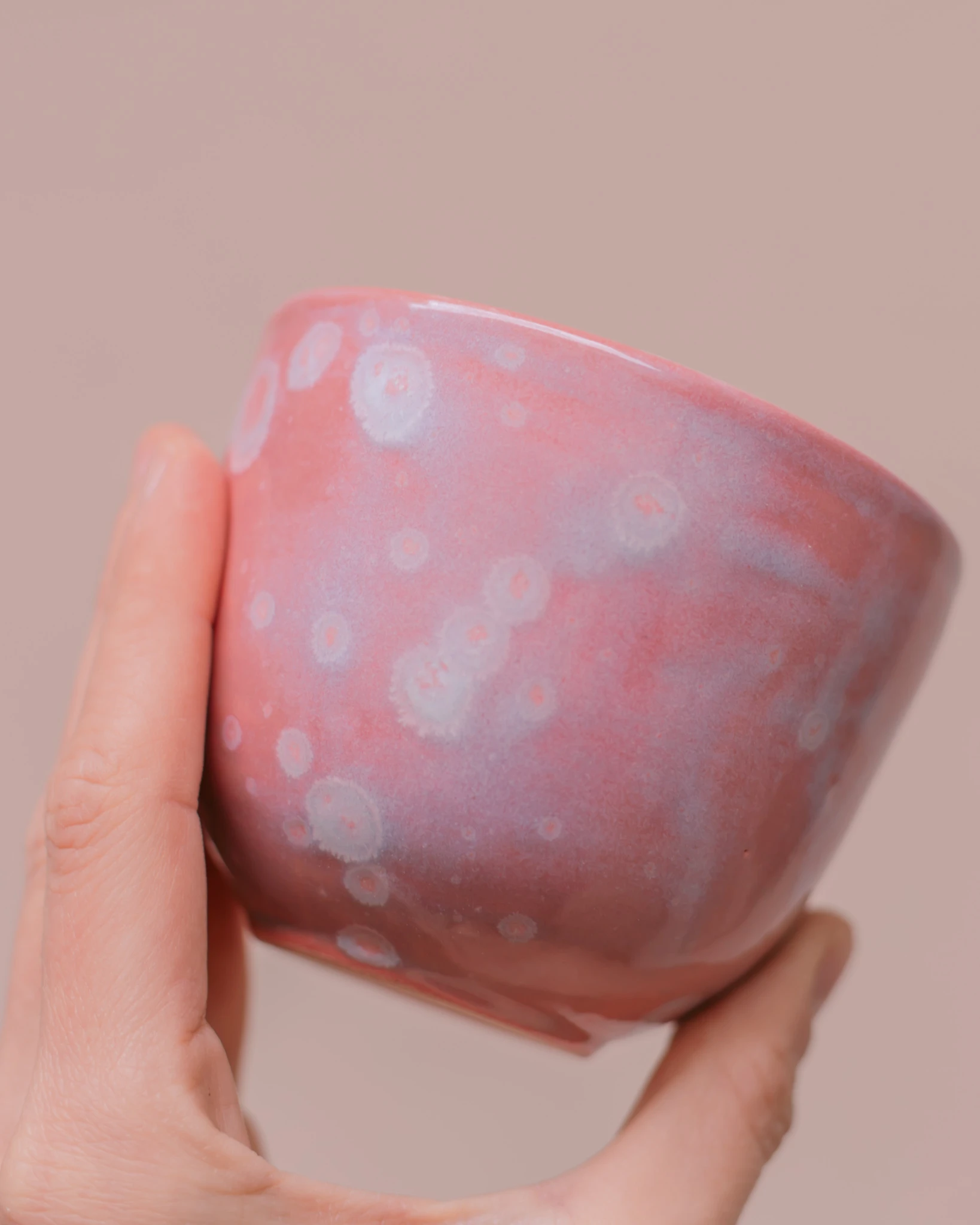 Ręcznie wykonana i szkliwiona czarka bez ucha, w kolorze różowo-niebieskim.