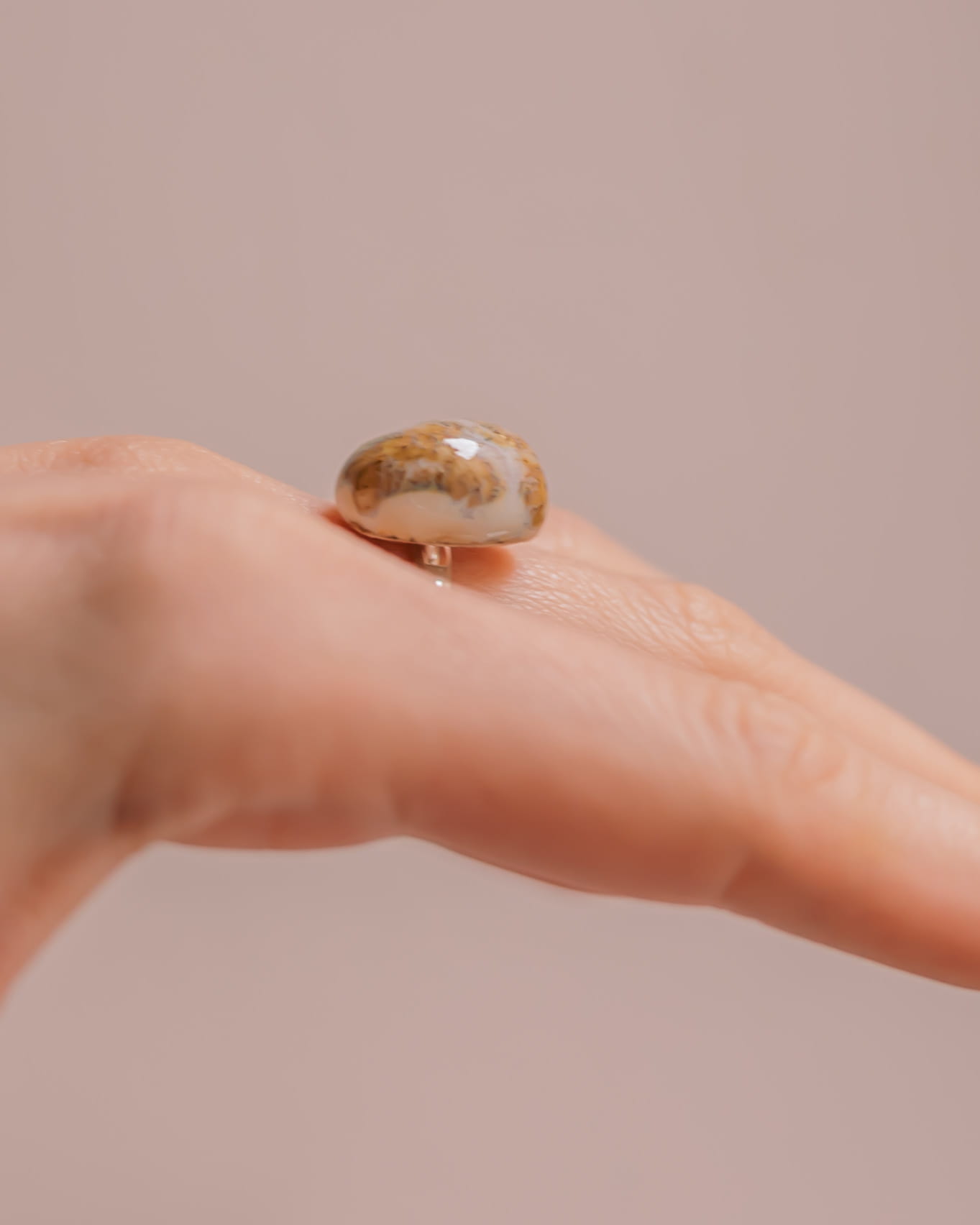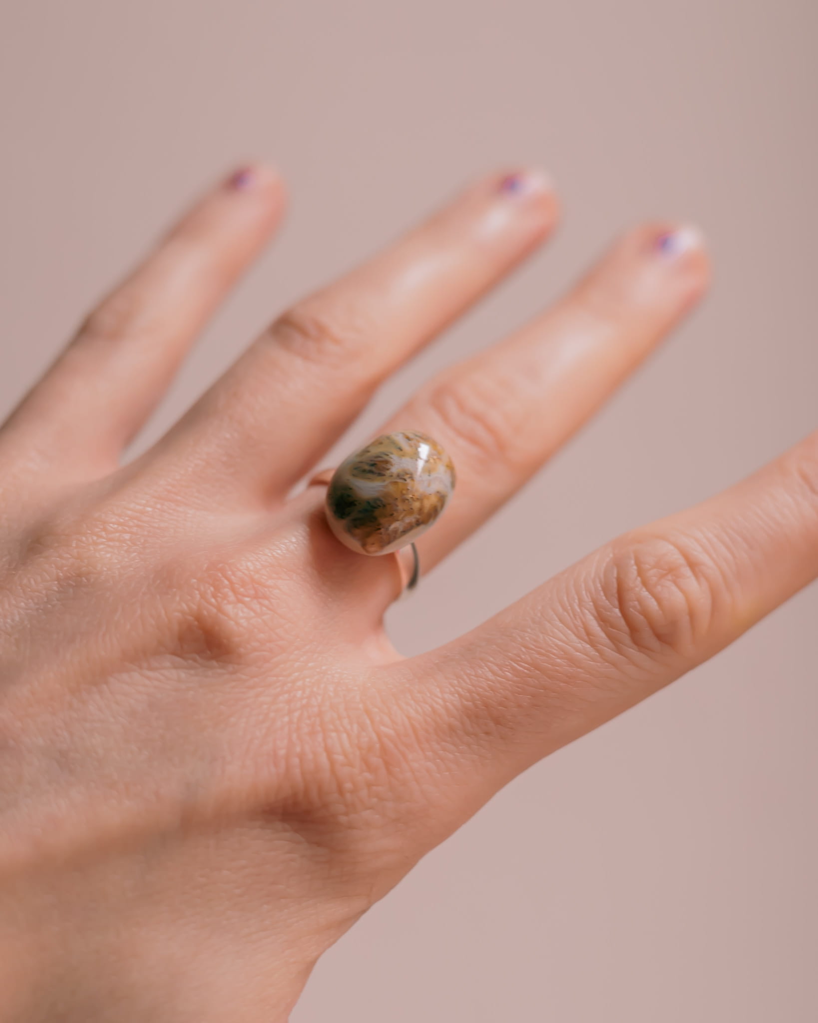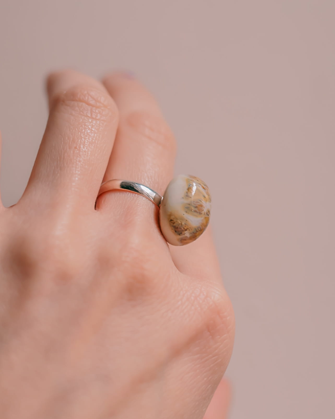 Ręcznie wykonany pierścionek ceramiczny na regulowanej szynie z mosiądzu. Każdy egzemplarz jest unikatowy, z delikatnymi różnicami w fakturze i kolorze, które podkreślają charakter handmade. Regulowana obrączka zapewnia wygodne dopasowanie i komfort noszenia na co dzień. <3